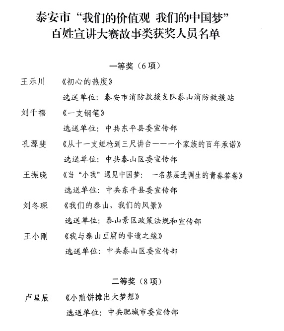 近日,中共泰安市委宣傳部等多部門(mén)聯(lián)合主辦的泰安市“我們的價(jià)值觀(guān)我們的中國(guó)夢(mèng)”百姓宣講大賽結(jié)果公布,泰山文旅集團(tuán)子公司泰山出品公司職工劉冬琛,憑借題為《我們的泰山,我們的風(fēng)景》的宣講,榮獲故事類(lèi)一等獎(jiǎng)。